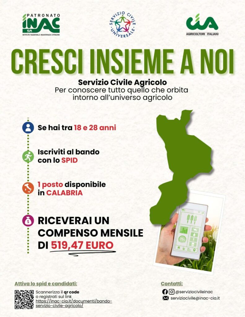 Cia Calabria, tramite il suo Patronato Inac, ha avviato la selezione di 57 giovani volontari per il servizio civile in 16 regioni italiane, con un’opportunità anche per la Calabria.