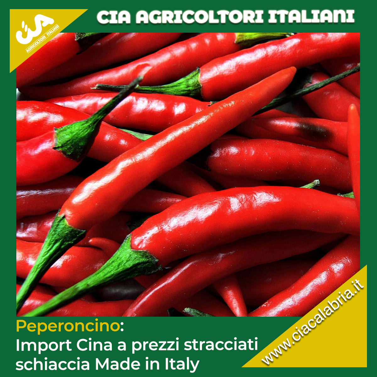 Quando si parla di gastronomia in Calabria, non si può fare a meno che pensare al peperoncino. Infatti nella cucina calabrese, in quasi tutti i piatti è presente. La nostra regione, oltre ad essere tra le prime per produzione nel Bel Paese, è quella che ne consuma di più. Ma nonostante tutto, la sola Calabria non basta a soddisfare la grande richiesta se si guarda oltre i confini regionali. Il peperoncino nostrano, per potere competere con gli altri produttori (Cina, Egitto e Turchia), necessita di una filiera di qualità superiore, innovativa e integrata. Questa bacca ottenuta da alcune varietà piccanti del genere di piante Capsicum, fino a poco tempo fa veniva coltivata per lo più negli orti di famiglia o nelle terrazze condominiali. Infatti, basti pensare che in Italia, da 10 kg di peperoncino fresco si ottiene 1 kg di prodotto essiccato, macinato in polvere pura al 100% e commerciabile a 15 euro, l’analogo prodotto dalla Cina ha un costo di soli 3 euro, ed è il risultato di tecniche di raccolta e trasformazione molto grossolane, con le quali la piantina viene interamente triturata –compresi picciolo, foglie, radici – con pochissime garanzie di qualità e requisiti fitosanitari ben diversi da quelli conformi ai regolamenti europei e anche quando il peperoncino viene importato fresco o semi-lavorato da Turchia o Egitto, la sua qualità viene compromessa dall’utilizzo di molti conservanti.