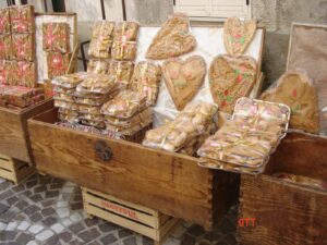 Ma la fiera non era soltanto vendere, comprare, mangiare, ma era soprattutto incontrarsi, il più delle volte scontrarsi nei vicoli stretti dove i profumi si facevano intensi e cangianti, ora lo spezzatino che borbottava in un testo di coccio su di una fornacetta a carbonelle, ora quel odore pungente di olio fritto che dorava tranci di baccalà buttati nelle padelle di ferro annerite e incrostate ; girato l’ angolo, l’ odore inebriante del vino che gurguliava allegro nelle caraffe e nei bicchieri, organetti fisarmoniche, che accompagnavano il canto di gente semplice resa euforica da qualche bicchiere di troppo, l’ abbaiare di qualche cane ,il raglio degli asini e dei muli nelle stalle dove non pochi χerari trascorrevano la notte. Profumi intensi… odori strani…mestieri che si intravedevano nelle botteghe scure come “u seggiaru” che aggiustava con la vuda qualche sedia sfondata, u stagnaru che costruiva imbuti lanterne in alluminio e arramava e stagnava coddara e stagnati , u forgiaru impegnatissimo in questi giorni a ferrare muli e ciucci facendogli una sorta di pedicure tagliando le spesse unghie per adattarle ai ferri nuovi ; bambini che si rincorrevano, bambini che giocavano a nocciole con l’ immancabile e il personalissimo mbaddu, che doveva buttare giù le quattro nocciole aggiustate a monticello totaru; colori sgargianti di stoffe, sorrisi luminosi di giovani donne, sguardi intensi nell’ attesa di parole sperate, incontri fugaci di giovani adolescenti, passo lento di uomini e donne segnati dalla fatica di tutti i giorni, le preghiere e i rosari infiniti delle donne anziane difronte alla Madonna dal manto azzurro nella chiesa dell’ Immacolata Illuminata come non mai.